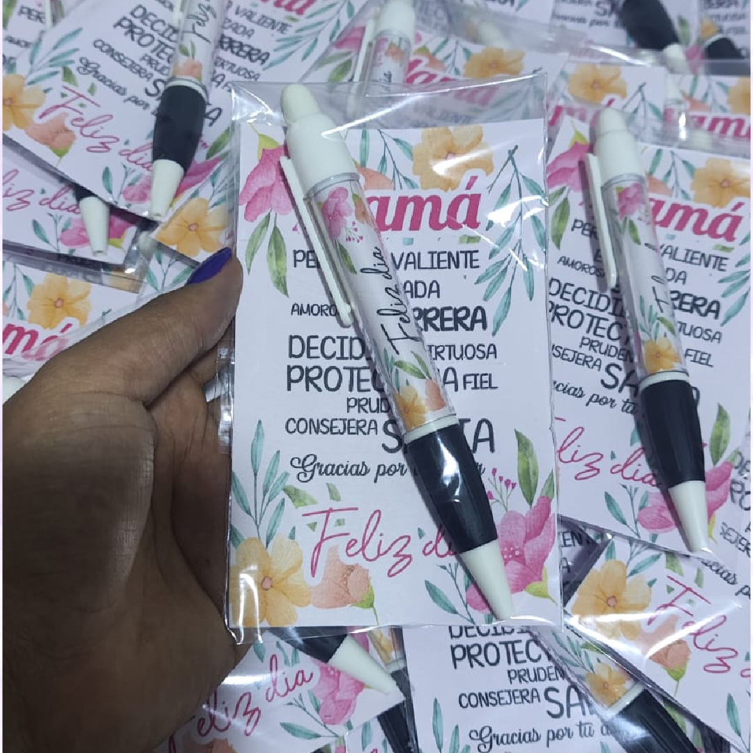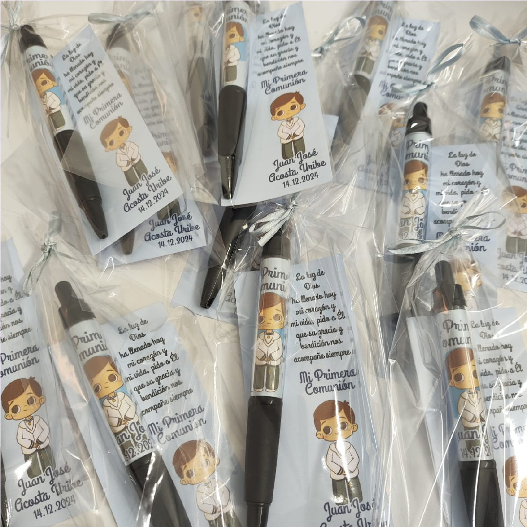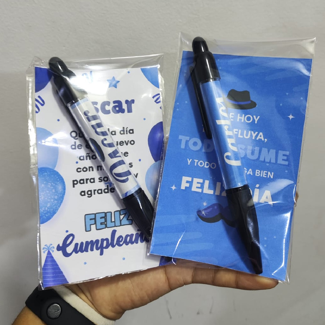 Incluye un lapicero de tinta negra con etiqueta personalizada a full color y una tarjeta decorativa, todo empacado en bolsita transparente para una mejor presentación.