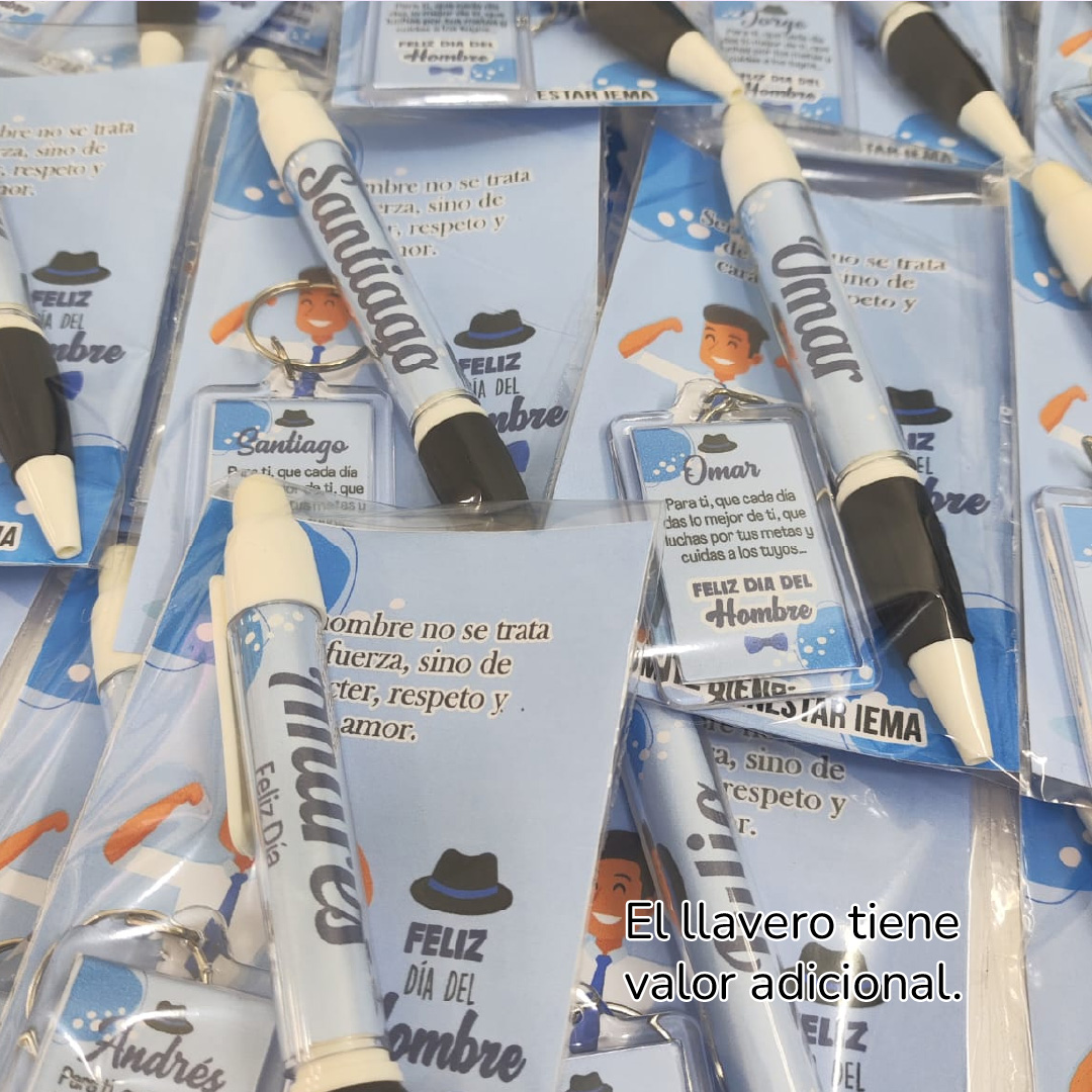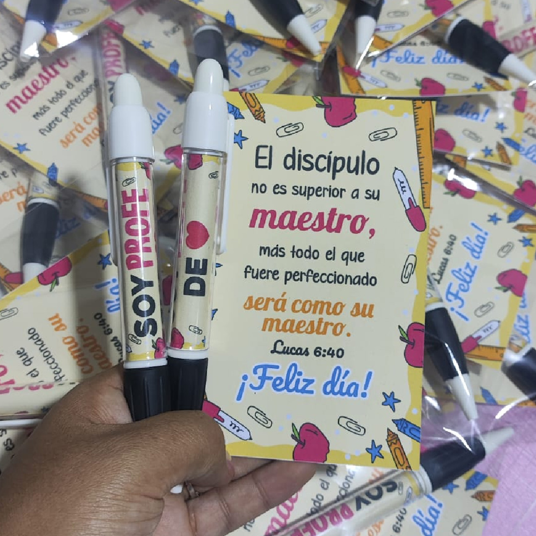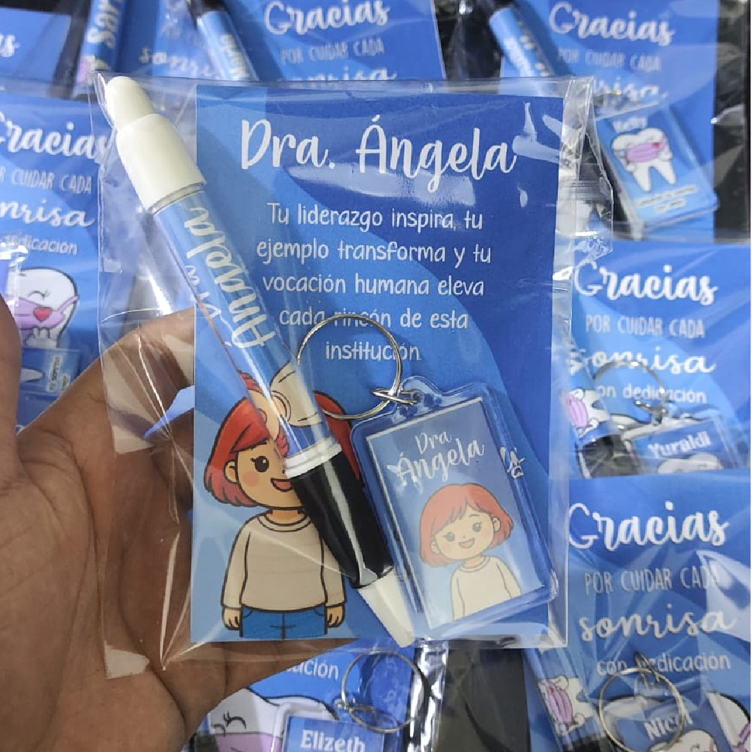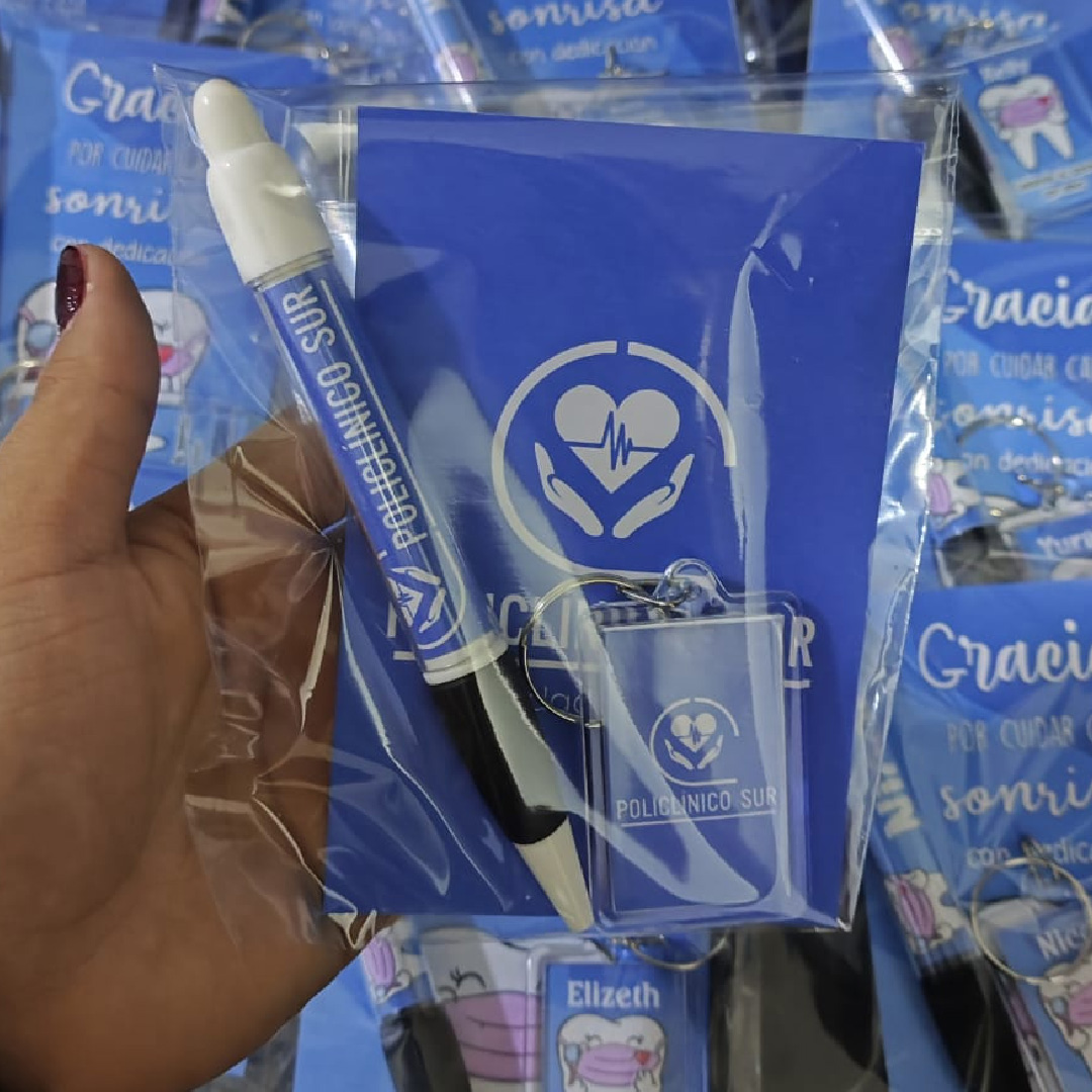 Incluye un lapicero de tinta negra con etiqueta personalizada a full color y una tarjeta decorativa, todo empacado en bolsita transparente para una mejor presentación.