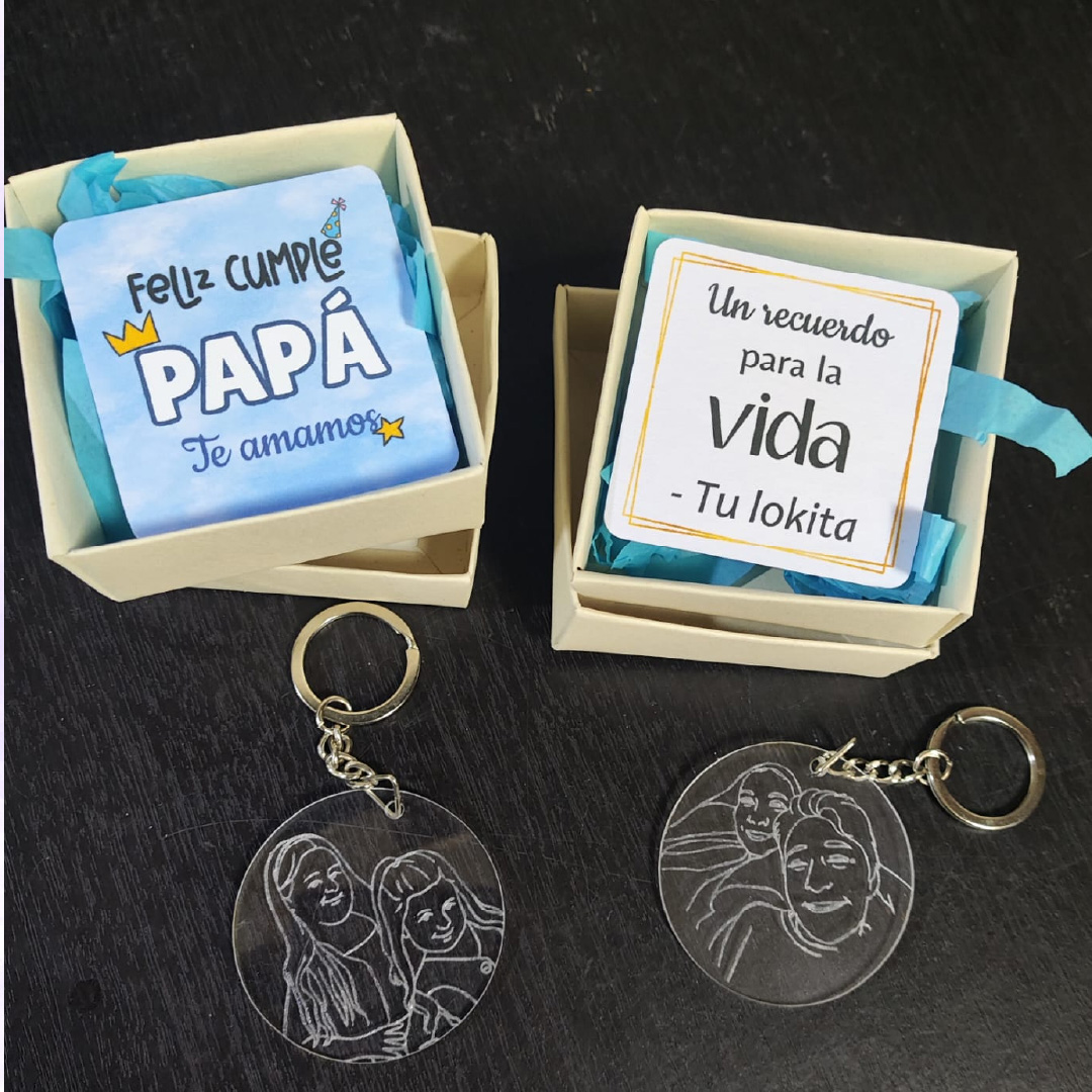 Nuestro Llavero Acrílico Personalizado con Foto Vectorizada En Cajita de Regalo transforma tus recuerdos en un detalle especial y duradero. A partir de una foto, realizamos una vectorización artística y la grabamos en láser sobre acrílico de alta calidad, además puedes escribir un mensaje en una tarjeta para hacer aún más especial tu regalo.