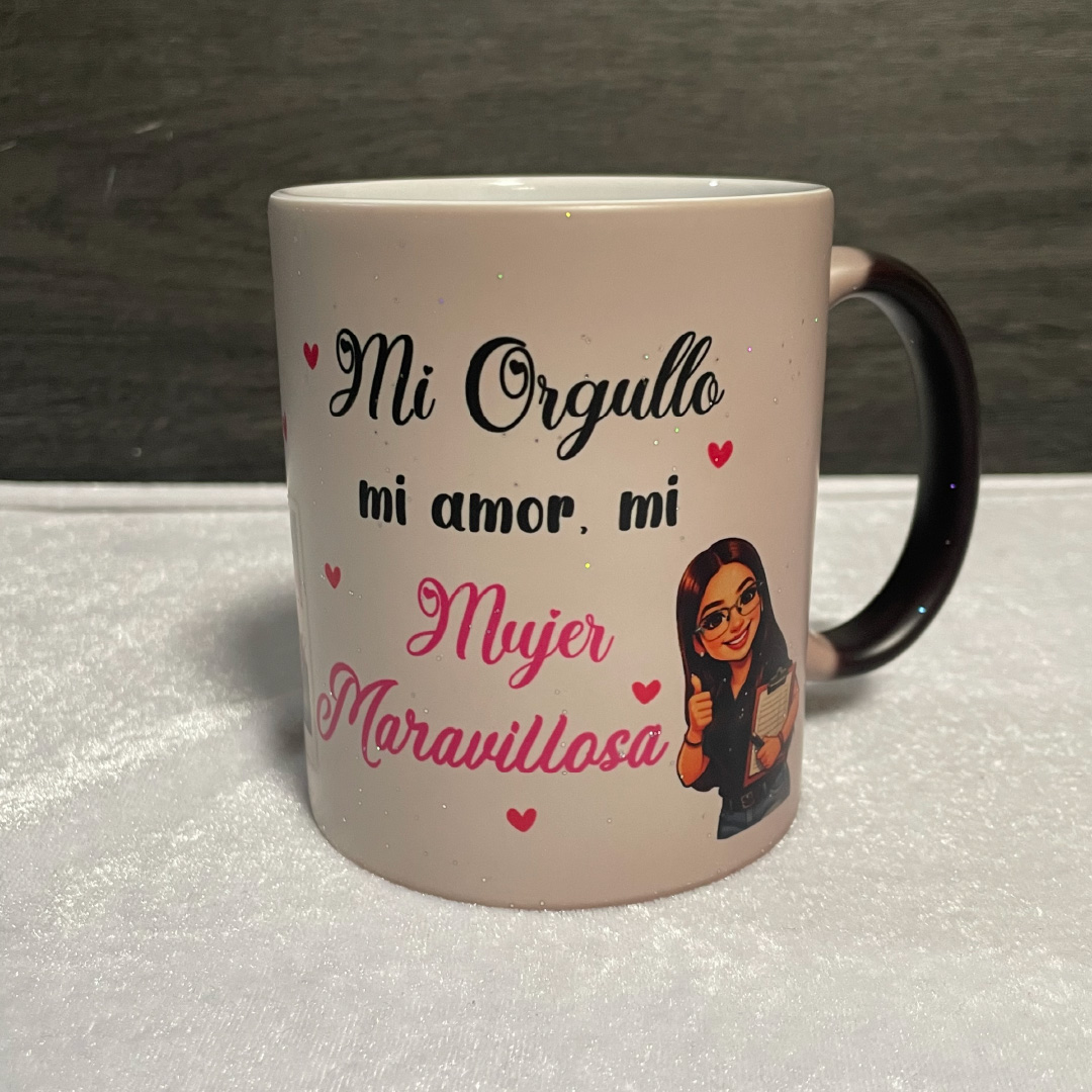 Taza mágica con efecto glitter personalizado que revela tu diseño con el calor. Personalízala con el nombre, frase o imagen que quieras, ideal para sorprender con un detalle único. 💜